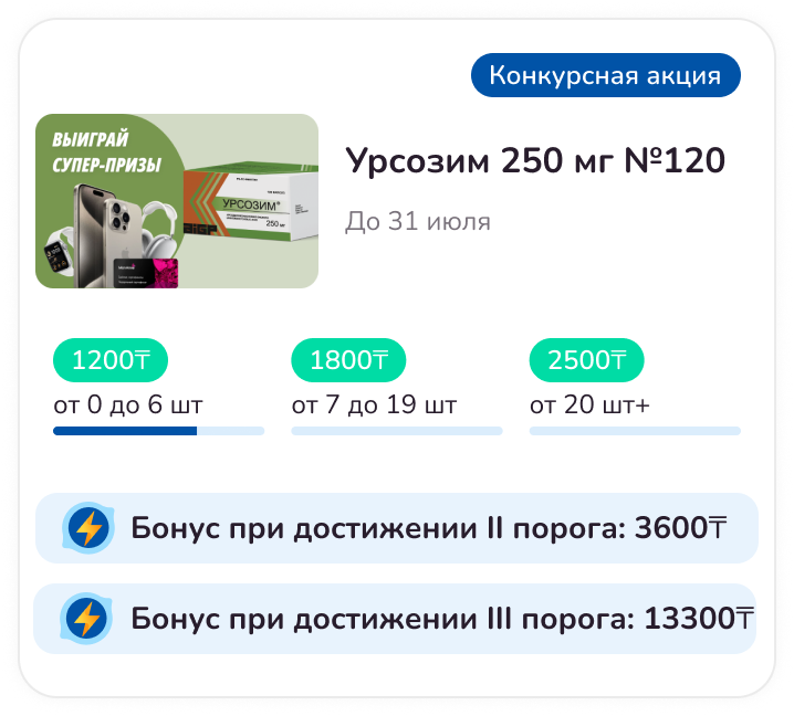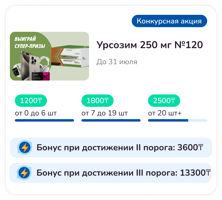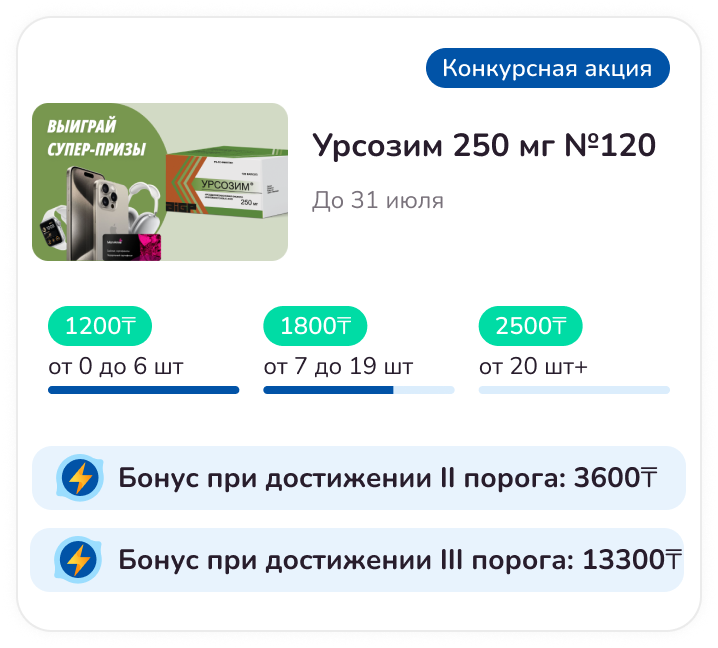 Екінші ұтыс ойынына Лифта №10, Лифта №20, Урсозим №60, Урсозим №120 акциялары бойынша 2024 жылдың 31 шілдесіне дейін №3 шекті деңгейге жеткен қолданба пайдаланушылары қатысады. Ұтыс ойынына қатысу үшін препараттардың біреуінің шарттарын орындау жеткілікті. 🚫Бірінші ұтыс ойынында жүлделі орындарға ие болған қатысушылар екінші ұтыс ойынына қатыспайды. Екінші ұтыс ойынының жеңімпаздары 2024 жылдың 2 тамызында, сағат 15.00-де, PharmaPay-дің Youtube парақшасында тікелей эфирде, You to Gift қызметінің онлайн рандомайзерінің көмегімен жарияланады.